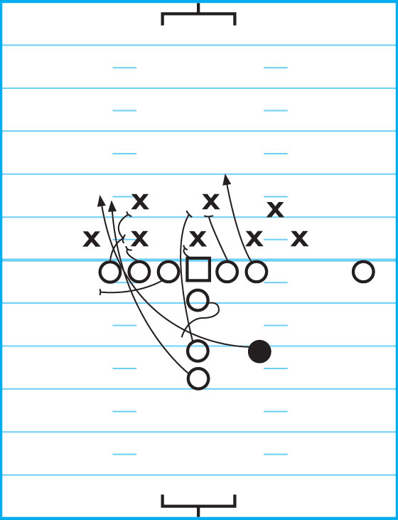 DIAGRAM 1: You can run a great boot leg off the play-action of this play.PLAYER RESPONSIBILITIES: Quarterback: Reverse pivots and fakes to diving fullback.Fullback: Takes the fake and fills vs. an even front or inside on the linebacker vs. an odd front.