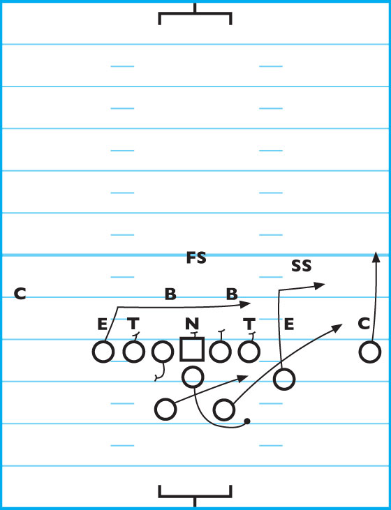 In this play, the QB sprints right at a 5-yard depth, reads the defense and throws to the first open receiver.PLAYER ASSIGNMENTS:Tight End: Runs a 5-yard deep drag pattern.Wing Back: Runs a 10-yard out pattern.Split End: Runs a fly pattern.Fullb