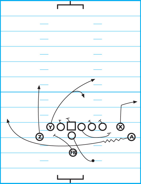 This is a great, unbalanced 1-back play that has scored 123 TDs for our team over a 15-year period. It’s very effective when run as a Jet Sweep fake. Receiver A goes in motion and gets the sweep fake. After executing the fake, the QB rolls right for 5-steps and reads the FS. Receiver Y (TE) releases over the middle, either finding a hole or dragging to the corner. Receiver Z hits the seam and X