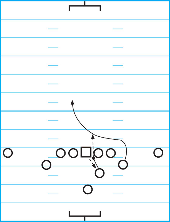DIAGRAM: This is a terrific fake punt and pass, set up well by what looks like a fake run by the personal protector. It’s best used in situations where the return team is coming on an all-out, punt-block attempt.The long snapper makes a direct snap to the PP, who secures the ball and runs