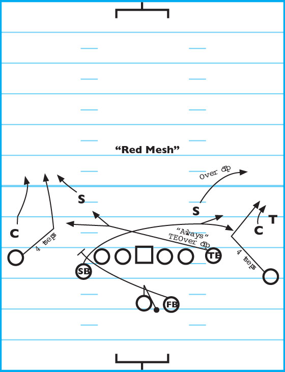 Theses are three effective plays from our short passing game. We use a simple terminology and numbering system to help players learn the formation and routes. “Red” refers to our formation. The numbers refer to routes and are as follows: “1” is an out-route at 4 to 6 yards, “2” is a deep slant, “3” is a deep-out route at 12 to 14 yards, “7” is a post-corner route, “8” is a post route,