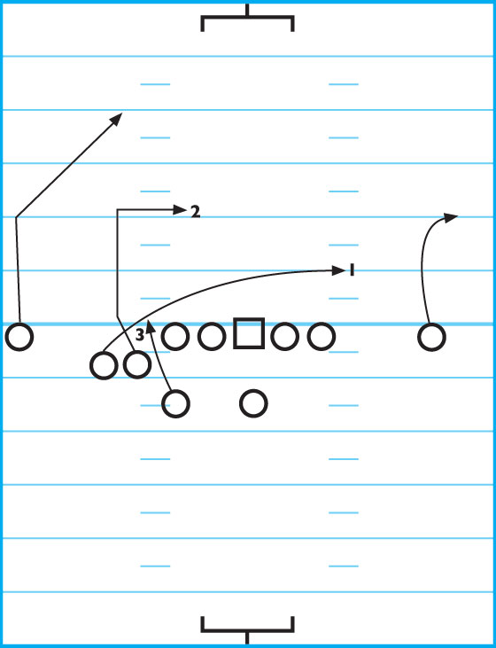 DIAGRAM: The linemen break the huddle and walk shoulder-to-shoulder to the line. They stay in a two-point stance with no splits. The left halfback goes in deep motion. The fullback fakes a pitch-out and yells, “Hurry up! Hurry up!” The right halfback stays low out of the hud
