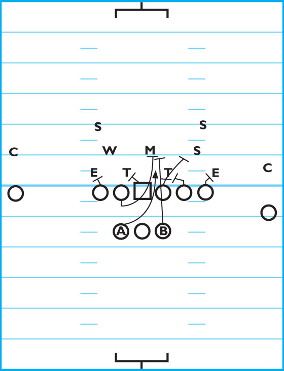 DIAGRAM C: Iso Gut. This is a basic iso play with the fullback leading on the Mike linebacker. The word “Gut” tells your backside offensive guard to lead through the A-gap strong. It is a good short yardage play to get two players in the hole. —Jay Roth, Footb