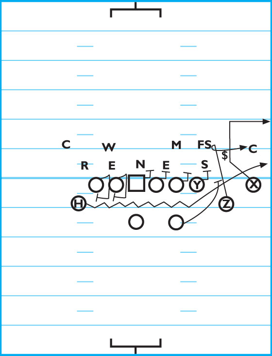 DIAGRAM A: Right Luke Gun H CAR 80 Deuce. This is a great 2-point conversion play or for use in short-yardage situations. Line up in an unbalanced formation and put the H-back in cross motion. You are looking for a rub against the H and the Z in man coverage. If the defens