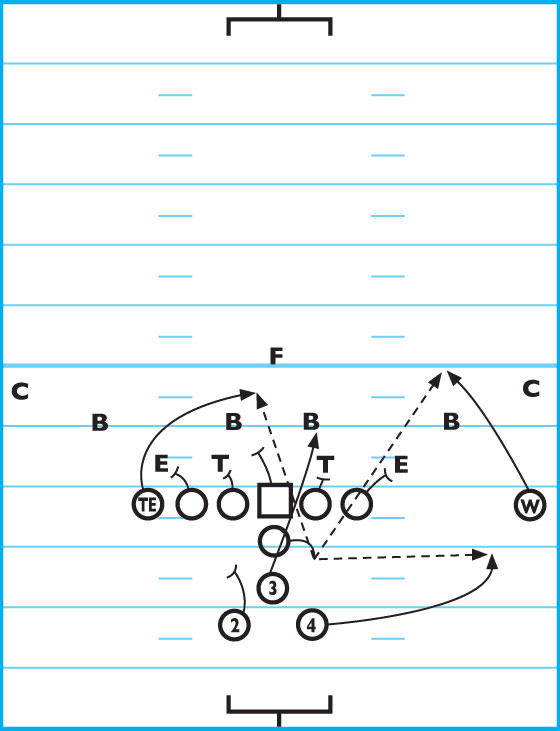 DIAGRAM: The linemen break the huddle and walk shoulder-to-shoulder to the line. They stay in a two-point stance with no splits. The left halfback goes in deep motion. The fullback fakes a pitch-out and yells, “Hurry up! Hurry up!” The right halfback stays low out of the hud