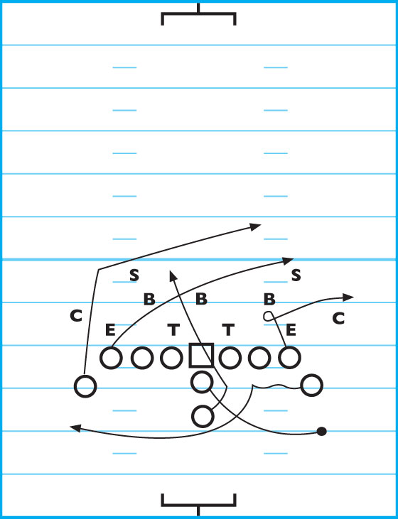 This is a great play-action pass out of our double-wing formation. By running the Jet sweep to the left a few times, you can usually set up this play and one of the receivers will be open. The key is to get the QB good depth on the boot leg and to have him do a good job of hiding the ball on his outside hip.