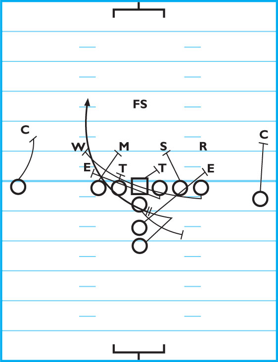 DIAGRAM: The left tackle blocks down on the linebacker. The left guard blocks down on the defensive tackle. The center blocks down on the DT. The right guard pulls and and blocks the defensive end. The right tackle blocks the first man he sees. The tight end pulls and leads through