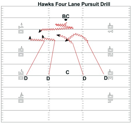 In diagram 2, our Four Lane Pursuit Drill, four lines of defensive players will be lined up on the 30-yard line, two on the numbers and two on the hash marks. We usually have the skill players on the numbers and the DL /MLB on the hashmarks. BC will at the 5-yard line.