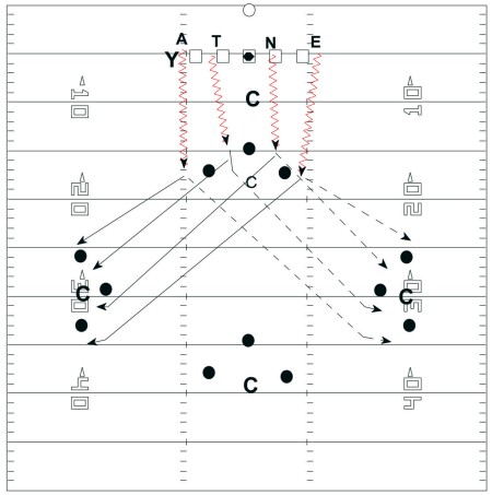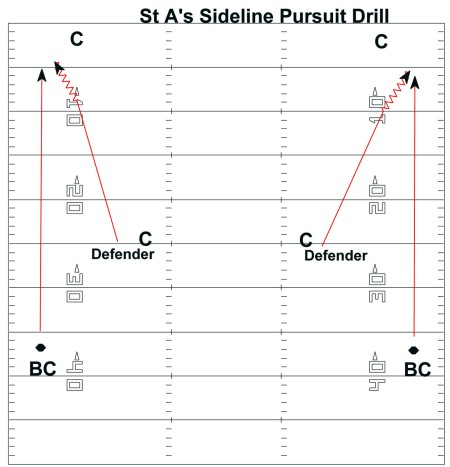 So much of the game is based on speed and agility that everyone is trying to match player against player. But the proper technique of playing the angles and keeping the ball on the appropriate shoulder is critical. The importance of correct pursuit angles will lead to better tackling skills and mechanics. This is very important when we talk to our players prior to introducing these pursuit drills. We will introduce and do all of these drills in fall camp and again in the spring.