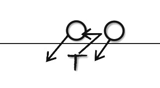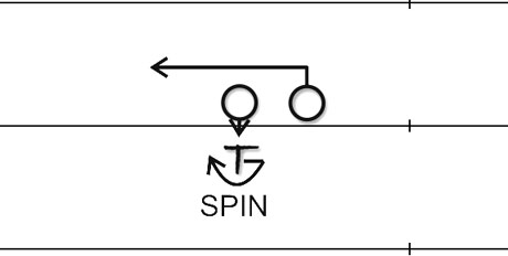 The next drill we do addresses the blood tackle technique. It consists of the players getting into groups of three: a blood tackle, an offensive guard and an offensive tackle. The blood tackle sets up over the offensive tackle and the guard will pull front side. The blood tackle sets up over the offensive tackle and the guard will pull front side. The blood tackle will yell pull and get in the guard’s hip pocket (See Diagram 1). The next step has the guard pulling backside and the blood tackle will recognize this spin and get a pursuit angle to the ball carrier. Note: The spin move is used any time one of our defensive linemen feels blocking pressure on his back (See Diagram 2). The final step of the drill involves the offensive tackle pulling and the guard blocking back on the blood tackle. The blood tackle will recognize this and either spin out of the block or rip underneath off the block (See Diagram 3).