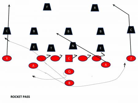 Once your team has established the base Rocket (toss) play to the perimeter, it is always a great change-up for the offense to fake the Rocket play and reverse the field, having your QB hit your B-back in the flat with a short pass. The defense should be flowing towards the perceived Rocket Toss play. This will leave your B-back in the flat by himself.
