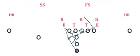 9. If the hand off goes to the RB and to your side of center, have the DE stay parallel to the LOS and have him be prepared to take on a trap blocker and shut the hole down. There is a good chance the opponent will try to run inside the DE without blocking him. Do not have him go upfield and open the gate until he reads who has the ball (Diagram 5).