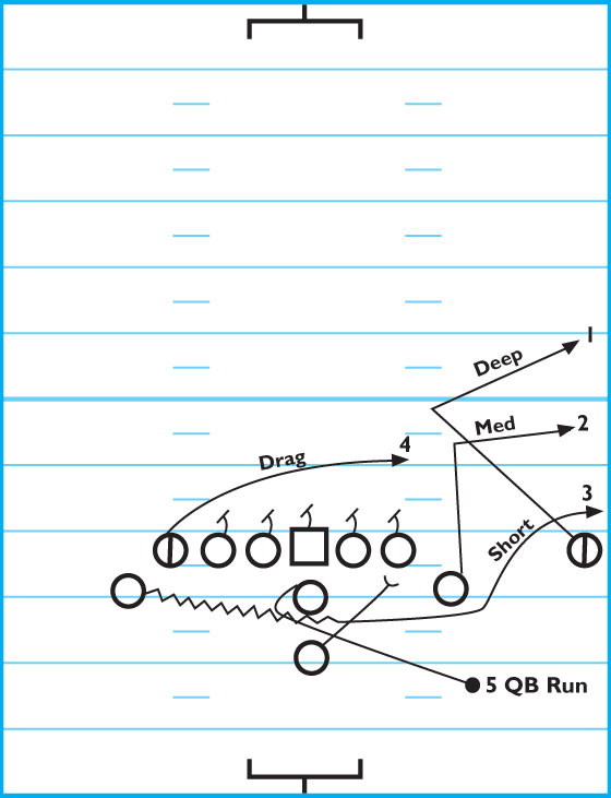 DIAGRAM: This is a great trick play to start off the game. It can also successfully be used around the mid-field area, directly after a turnover or in short-yardage downs such as a 1st-and-5 or 2nd-and-1 situation. It’s best to use against a 4-3 Cover 2.Quarterb